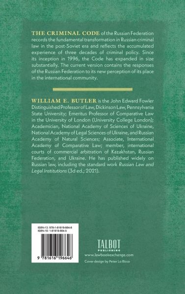 The Criminal Code of the Russian Federation records the fundamental transformation in Russian criminal law in the post-Soviet era and reflects the accumulated experience of three decades of criminal policy. Since its inception in 1996, the Code has expanded in size substantially. The current version contains the responses of the Russian Federation to its new perception of its place the international community. William E. Butler is the John Edward Fowler Distinguished Professor of Law, Dickinson Law, Pennsylvania State University; Emeritus Professor of Comparative Law in the University of London (University College London); Academician, National Academy of Sciences of Ukraine, National Academy of Legal Sciences of Ukraine, and Russian Academy of Natural Sciences; Associate, International Academy of Comparative Law; member, international courts of commercial arbitration of Kazakhstan, Russian Federation, and Ukraine. He has published widely on Russian law, including the standard work Russian Law and Legal Institutions (3d ed.; 2021). liv, 409 pp.