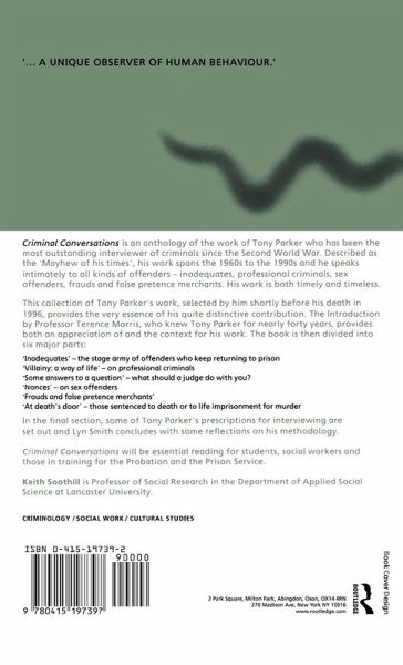 Criminal Conversations is an anthology of the work of Tony Parker who has been the most outstanding interviewer of criminals since the Second World War. This collection, selected by him shortly before his death in 1996, provides the very essence of his quite distinctive contribution. In it he speaks intimately to all kinds of people including offenders, inadequates, professional criminals, sex offenders, frauds and false pretence merchants. It also includes interviews with prisoners on death row. Lyn Smith concludes with some reflections on his methodology. This collection celebrates an outstanding body of work and provides a fascinating insight into the criminal mind and experience. It will be compelling reading not only for those studying criminology, probation or prison studies, but also for the interested general reader.