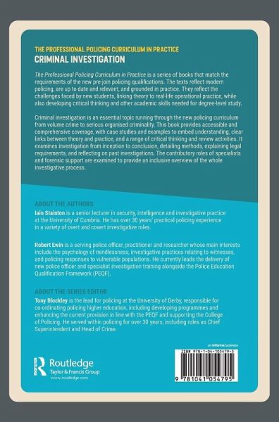 Iain Stainton is senior lecturer in security, intelligence and investigative practice at the University of Cumbria. He has over 30 years' practical policing experience in a variety of overt and covert investigative roles, which prepared him to deliver a range of investigative training within a law enforcement environment. The transition to academia allowed him to make links between theory, research and professional practice. He has experienced a wide variety of training in both policing and higher education, and values the practitioner-led approach to learning. Robert Ewin is a serving police officer, practitioner, and researcher, with experiences and publications around dealing with vulnerability within the criminal investigation setting. His main interests include the psychology of mindlessness, investigative practices relating to witnesses, and policing responses to vulnerable populations. He currently leads the delivery of new police officer training and specialist investigation training alongside the Police Educational Qualification Framework. He has experience in business continuity for online training delivery. Tony Blockley has served within policing for over 30 years, gaining extensive knowledge and understanding of policing organisation and practice. On retirement he had attained the rank of Chief Superintendent with the position of Head of Crime, responsible for leading 500+ multi-disciplinary staff within a complex and critical department servicing public protection, major and serious crime, serious and organised crime, terrorism, financial crime, fraud and forensic services. As the lead for policing at the University of Derby he is responsible for co-ordinating policing higher education, including developing programmes and enhancing current provision in line with the Police Education Qualification Framework (PEQF) while also supporting the College of Policing in the development of programmes. He combines an extensive policing career with an understanding of the national curriculum, the requirements of the academic standards and the entry routes to policing, giving him a unique perspective and the necessary credibility to support his role as Editor of Critical Publishing's new policing series.