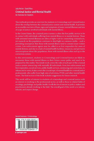 This textbook provides an overview for students in Criminology and Criminal Justice about the overlap between the criminal justice system and mental health. It provides an accessible overview of basic signs and symptoms of major mental illnesses and size of scope of justice-involved individuals with mental illness.
