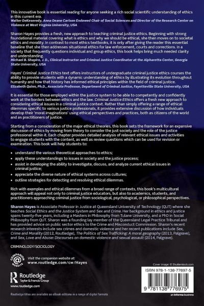 It is essential for those employed within the justice system to be able to competently and confidently work at the borders between ethics and the law. Criminal Justice Ethics offers a fresh new approach to considering ethical issues in a criminal justice context. Rather than simply offering a range of ethical dilemmas specific to various justice professionals, it provides extensive discussion of how individuals develop their 'moral imaginations' using ethical perspectives and practices, both as citizens of the world and as practitioners of justice. Starting from a consideration of the major ethical theories, this book sets the framework for an expansive discussion of ethics by moving from theory to consider the just society and the role of the justice professional within it. Each chapter provides detailed analysis of relevant ethical issues, and activities to engage students with the content, as well as review questions, which can be used for revision or examination. This book will help students to: understand the various theoretical approaches to ethics, apply these understandings to issues in society and the justice process, assist in developing the ability to investigate, discuss, and analyse current ethical issues in criminal justice, appreciate the diverse nature of ethical systems across cultures, outline strategies for detecting and resolving ethical dilemmas. Rich with examples and ethical dilemmas from a broad range of contexts, this book's multicultural approach will appeal not only to criminal justice educators, but also to academics, students and practitioners approaching criminal justice from sociological, psychological or philosophical perspectives.