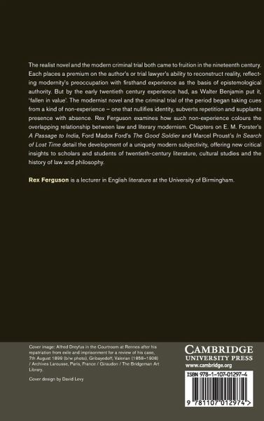 The realist novel and the modern criminal trial both came to fruition in the nineteenth century. Each places a premium on the author's or trial lawyer's ability to reconstruct reality, reflecting modernity's preoccupation with firsthand experience as the basis of epistemological authority. But by the early twentieth century experience had, as Walter Benjamin put it, 'fallen in value'. The modernist novel and the criminal trial of the period began taking cues from a kind of nonexperience - one that nullifies identity, subverts repetition and supplants presence with absence. Rex Ferguson examines how such nonexperience colours the overlapping relationship between law and literary modernism. Chapters on E. M. Forster's A Passage to India, Ford Madox Ford's The Good Soldier and Marcel Proust's In Search of Lost Time detail the development of a uniquely modern subjectivity, offering new critical insight to scholars and students of twentieth-century literature, cultural studies, and the history of law and philosophy.
