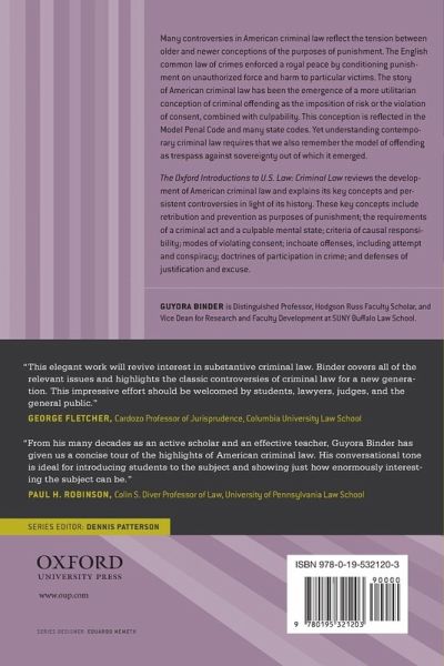Many controversies in American criminal law reflect the tension between older and newer conceptions of the purposes of punishment. The English common law of crimes enforced a royal peace by conditioning punishment on unauthorized force and harm to particular victims. The story of American criminal law has been the emergence of a more utilitarian conception of criminal offending as the imposition of risk or the violation of consent, combined with culpability. This conception is reflected in the Model Penal Code and many state codes. Yet understanding contemporary criminal law requires that we also remember the model of offending as trespass against sovereignty out of which it emerged. The Oxford Introductions to U.S. Law: Criminal Law reviews the development of American criminal law and explains its key concepts and persistent controversies in light of its history. These key concepts include retribution and prevention as purposes of punishment; the requirements of a criminal act and a culpable mental state; criteria of causal responsibility; modes of violating consent; inchoate offenses, including attempt and conspiracy; doctrines of participation in crime; and defenses of justification and excuse.