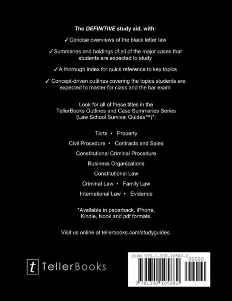 The definitive law school study aid, with: ¿Concise overviews of the black letter law ¿Summaries and holdings of all of the major cases that students are expected to study ¿A thorough index for quick reference to key topics ¿ Concept-driven outlines covering the topics students are expected to master for class and the bar exam Look for all of these titles in the TellerBooks Outlines and Case Summaries Series (Law School Survival Guides(TM))*: Torts ¿ Property ¿ Civil Procedure ¿ Contracts and Sales ¿ Constitutional Criminal Procedure ¿ Business Organizations ¿ Constitutional Law ¿ Criminal Law ¿ Family Law ¿ International Law ¿ Evidence *Available in paperback, iPhone, Kindle, Nook and pdf formats. Visit us at tellerbooks.com/studyguides.