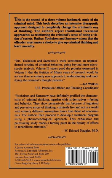 This is the second of a three volume landmark study of the criminal mind. This book describes an intensive therapeutic approach designed to completely change the criminals way of thinking. The authors reject traditional treatment approaches as reinforcing of the criminals sense of being a victim of society. Rather Yochelson and Samenow stress that the criminal must make a choice to give up criminal thinking and learn morality. A Jason Aronson Book