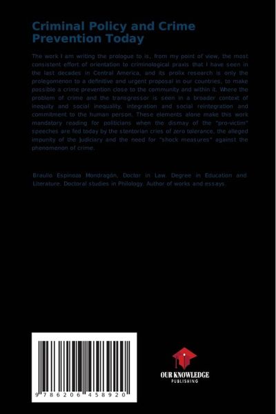 The work I am writing the prologue to is, from my point of view, the most consistent effort of orientation to criminological praxis that I have seen in the last decades in Central America, and its prolix research is only the prolegomenon to a definitive and urgent proposal in our countries, to make possible a crime prevention close to the community and within it. Where the problem of crime and the transgressor is seen in a broader context of inequity and social inequality, integration and social reintegration and commitment to the human person. These elements alone make this work mandatory reading for politicians when the dismay of the "pro-victim" speeches are fed today by the stentorian cries of zero tolerance, the alleged impunity of the Judiciary and the need for "shock measures" against the phenomenon of crime.