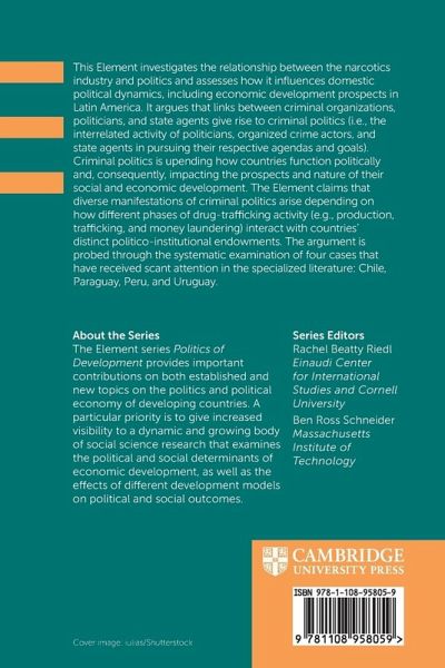 This Element investigates the relationship between the narcotics industry and politics. It claims that different manifestations of criminal politics arise depending on how different phases of drug-trafficking activity interact with the distinct politico-institutional endowments of Chile, Paraguay, Peru, and Uruguay.