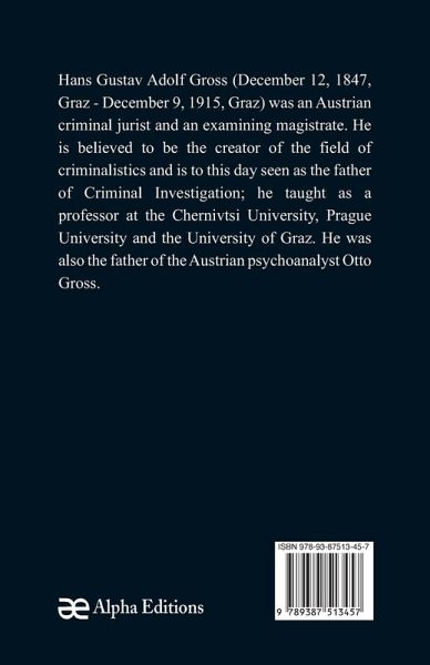Hans Gustav Adolf Gross (December 12, 1847, Graz - December 9, 1915, Graz) was an Austrian criminal jurist and an examining magistrate. He is believed to be the creator of the field of criminalistics and is to this day seen as the father of Criminal Investigation; he taught as a professor at the Chernivtsi University, Prague University and the University of Graz. He was also the father of the Austrian psychoanalyst Otto Gross.