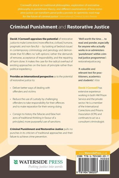 David J Cornwell appraises the potential of restorative justice to make 'corrections' more effective, civilised, humane, pragmatic and non-fanciful - by looking at 'bedrock issues' in contemporary criminology and penology and demonstrate that RJ offers no 'soft options', rather the demands of remorse, acceptance of responsibility, and the repairing of harm done. It makes the case for the radical overhaul of existing approaches on the basis of principle rather than political expediency. Provides an international perspective as to the potential of restorative justice to: Deliver better ways of dealing with offenders and victims; Reduce the use of custody by challenging offenders to take responsibility for their offences and to make reparation for their wrong-doing; Consign to history the fallacies and false horizons of traditional thinking in favour of a principled, more purposeful use of sanctions. Criminal Punishment and Restorative Justice pulls no punches in its criticism of traditional approaches and their failure to achieve crime prevention. 'This short book is well worth the time and effort to read and ponder, especially for anyone who actually works in or administers 'punishment' within criminal justice programmes': restorativejustice.org. 'Cornwell's attack on traditional philosophies, exploration of restorative philosophy in punishment theory, and different examinations of how restorative justice can transform penal policy provide an optimistic road map for the future of criminal justice': International Criminal Justice Review. 'A valuable and relevant text for practitioners, academics and students': Vista. David J Cornwell has extensive experience working in both HM Prison Service and the private sector. He is a member of the International Corrections and Prisons Association (ICPA) and continues to act as a consultant criminologist.