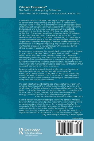 Crude oil extraction in the Niger Delta region of Nigeria generates 96% of all foreign earnings and 85% of state revenues, making it crucial to the survival of the Nigerian state. Several generations of state neglect, corruption and mismanagement have ensured that the Delta region is one of the most socio-economically and politically deprived in the country. By the late 1990s there was a frightening proliferation of armed gangs and insurgent groups. Illegal oil bunkering, pipeline vandalism, disruption of oil production activities, riots, and demonstrations intensified and in 2003, insurgents began kidnapping oil workers at a frenetic pace. In late 2005, an uber-insurgent movement 'organization' was formed in Nigeria. Christened the Movement for the Emancipation of the Niger Delta (MEND), it operates as an amorphous, multifaceted amalgam of insurgent groups with an unprecedented clinical precision in execution of intents. By focussing on kidnappings that are putatively connected to the struggle for emancipating the Niger Delta, Oriola makes the case for analysing MEND as a social movement organization, rather than a terrorist or criminal gang by showing how political processes shape kidnappings in the Delta. The use of violent repertoires of contention has not garnered sufficient attention in the social movement literature, despite the fact that that around the world, many similar groups are adopting violent tactics without necessarily eschewing non-violent techniques. Based on multi-actor research, including interviews and focus group discussions with community members, military authorities, 42 ex-insurgents directly involved in illegal oil bunkering and kidnapping, and official email statements from 'Jomo Gbomo', the spokesperson of MEND, this book will be of interest to sociologists, political scientists and peace and security studies scholars.