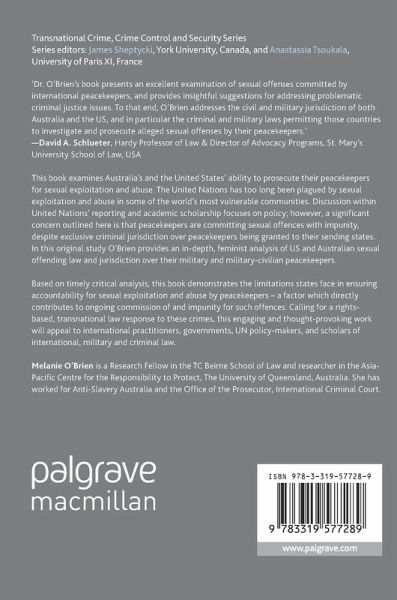 This book examines Australia's and the United States' ability to prosecute their peacekeepers for sexual exploitation and abuse. The United Nations has too long been plagued by sexual exploitation and abuse in some of the world's most vulnerable communities. Discussion within United Nations' reporting and academic scholarship focuses on policy; however, a significant concern outlined here is that peacekeepers are committing sexual offences with impunity, despite exclusive criminal jurisdiction over peacekeepers being granted to their sending states. In this original study O'Brien provides an in-depth, feminist analysis of US and Australian sexual offending law and jurisdiction over their military and military-civilian peacekeepers. Based on timely critical analysis, this book demonstrates the limitations states face in ensuring accountability for sexual exploitation and abuse by peacekeepers - a factor which directly contributes to ongoing commission of and impunity for such offences. Calling for a rights-based, transnational law response to these crimes, this engaging and thought-provoking work will appeal to international practitioners, governments, UN policy-makers, and scholars of international, military and criminal law.