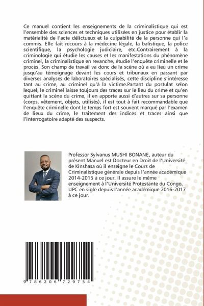 Ce manuel contient les enseignements de la criminalistique qui est l'ensemble des sciences et techniques utilisées en justice pour établir la matérialité de l'acte délictueux et la culpabilité de la personne qui l'a commis. Elle fait recours à la médecine légale, la balistique, la police scientifique, la psychologie judiciaire, etc.Contrairement à la criminologie qui étudie les causes et les manifestations du phénomène criminel, la criminalistique en revanche, étudie l'enquête criminelle et le procès. Son champ de travail va donc de la scène où a eu lieu un crime jusqu'au témoignage devant les cours et tribunaux en passant par diverses analyses de laboratoires spécialisés, cette discipline s'intéresse tant au crime, au criminel qu'à la victime.Partant du postulat selon lequel, le criminel laisse toujours des traces sur le lieu du crime et qu'en quittant la scène du crime, il en apporte aussi d'autres sur sa personne (corps, vêtement, objets, utilisés), il est tout à fait recommandable que l'enquête criminelle dont le temps fort est souvent marqué par l'examen de lieux du crime, le traitement des indices et traces ainsi que l'interrogatoire adapté des suspects.