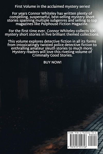 First Volume in the acclaimed mystery series! For years Connor Whiteley has written plenty of compelling, suspenseful, best-selling mystery short stories spanning multiple subgenres and selling to top magazines like Pulphouse Fiction Magazine. For the first time ever, Connor Whiteley collects 100 mystery short stories in five brilliant themed collections. This volume explores detective fiction in all its forms from intoxicatingly twisted police detective fiction to enthralling amateur sleuth stories to much more. Mystery readers will love this riveting volume of Criminally Good Stories. BUY NOW!