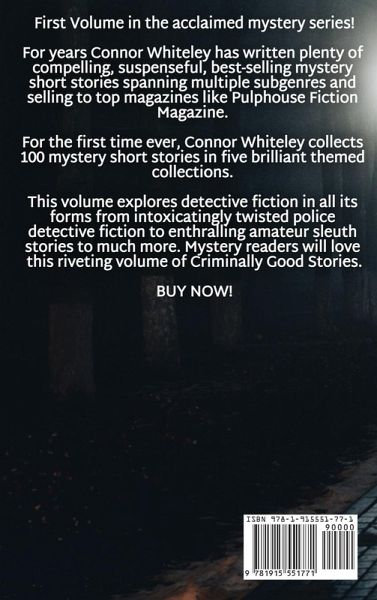 First Volume in the acclaimed mystery series! For years Connor Whiteley has written plenty of compelling, suspenseful, best-selling mystery short stories spanning multiple subgenres and selling to top magazines like Pulphouse Fiction Magazine. For the first time ever, Connor Whiteley collects 100 mystery short stories in five brilliant themed collections. This volume explores detective fiction in all its forms from intoxicatingly twisted police detective fiction to enthralling amateur sleuth stories to much more. Mystery readers will love this riveting volume of Criminally Good Stories. BUY NOW!