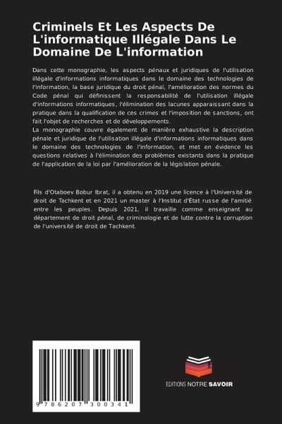Dans cette monographie, les aspects pénaux et juridiques de l'utilisation illégale d'informations informatiques dans le domaine des technologies de l'information, la base juridique du droit pénal, l'amélioration des normes du Code pénal qui définissent la responsabilité de l'utilisation illégale d'informations informatiques, l'élimination des lacunes apparaissant dans la pratique dans la qualification de ces crimes et l'imposition de sanctions, ont fait l'objet de recherches et de développements.La monographie couvre également de manière exhaustive la description pénale et juridique de l'utilisation illégale d'informations informatiques dans le domaine des technologies de l'information, et met en évidence les questions relatives à l'élimination des problèmes existants dans la pratique de l'application de la loi par l'amélioration de la législation pénale.