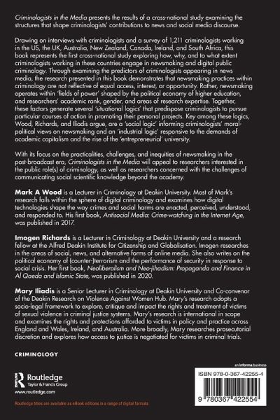 "Why do Criminologists engage with news and social media? And what are the dilemmas of such engagements? In Criminologists in the Media the authors expertly dissect these concerns, situating them within the broader social, political and economic imperatives of contemporary academia in a digital age. The result is a compelling and informed analysis of public criminology through the lens of 'newsmaking' and the impact of research within, and for, broader publics. Criminologists in the Media is a critical resource for established and emerging scholars alike, as they reflect on their own public engagements and the impacts of these for academia more widely."