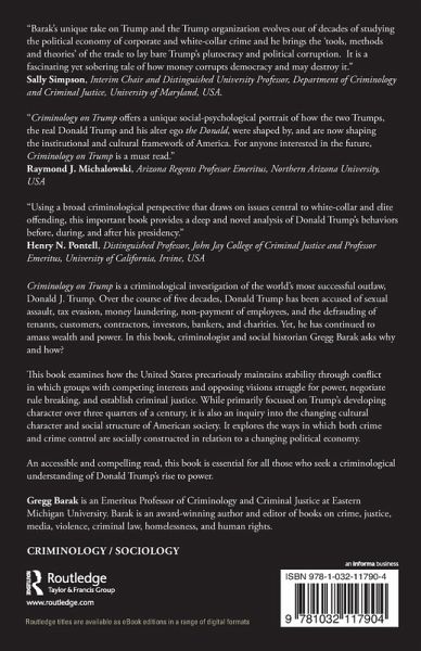 Criminology on Trump is a criminological investigation of the world's most successful outlaw, Donald J. Trump. Over the course of five decades, Donald Trump has been accused of sexual assault, tax evasion, money laundering, non-payment of employees, and the defrauding of tenants, customers, contractors, investors, bankers, and charities. Yet, he has continued to amass wealth and power. In this book, criminologist and social historian Gregg Barak asks why and how?