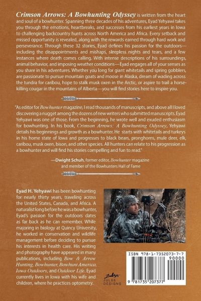 Crimson Arrows: A Bowhunting Odyssey, is written from the heart and soul of a bowhunter. Spanning three decades of his adventures, Eyad Yehyawi takes you through the emotions, heartbreaks, and successes from his earliest years in Iowa, to physically and psychologically challenging backcountry hunts in Alaska and Canada, to a breathtaking African safari. Every setback and missed opportunity is revealed, along with the rewards earned through hard work and perseverance. Through these 32 stories, Eyad defines his passion for the outdoors, including the disappointments and mishaps, sleepless nights and tears, and a few instances where death comes calling. With intense descriptions of his surroundings, animal behavior, and imposing weather conditions, Eyad engages all your senses as you share his adventures. Whether you long for giant whitetails and spring gobblers, are passionate to pursue mountain goats and moose in Alaska, dream of wading across the tundra for caribou, hope to stalk musk oxen in the Arctic, or aspire to trail a horse-killing cougar in the mountains of Alberta, you'll find stories here to inspire you.