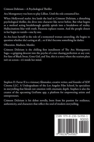 Crimson Delirium - A Psychological Thriller Ava Montgomery was born to play Lillian. Until the role consumed her. When Hollywood starlet Ava lands the lead in Crimson Delirium, a disturbing psychological thriller, she dives into character like never before. But what begins as a method acting breakthrough quickly spirals into a breakdown of reality. Hallucinations blur with truth. Paranoia replaces reason. And the people closest to her begin to vanish-one by one. As Ava loses herself in the role of a tormented woman unraveling, she begins to question whether she's acting at all... or if she's become something far darker. Obsession. Madness. Murder. Crimson Delirium is the chilling first installment of The Ava Montgomery Saga-a gripping descent into the psyche of a star chasing perfection at any cost. For fans of Black Swan, Gone Girl, and You, this is a story where the scariest place isn't on screen-it's inside her mind.