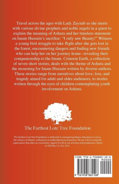Travel across the ages with Lady Zaynab as she meets with various divine prophets and noble angels in a quest to explain the meaning of Ashura and her timeless statement on Imam Hussein's sacrifice: "I only saw Beauty!" Witness a young bird struggle to take flight after she gets lost in the forest, encountering dangers and finding new friends who can help her on her journey home--revealing their companionship to the Imam. Crimson Earth, a collection of seven short stories, deals with the theme of Ashura and the mourning for Imam Hussain written by diverse authors. These stories range from narratives about love, loss, and tragedy aimed for adult and older audiences, to stories written through the eyes of children contemplating youth involvement on Ashura. The stories were specially selected and presented at Harvard University prior to publication. Three of the stories were contestant winners at the Ahlul Bayt Collective 2021 short story call: "A Eternity in a Day," "Love and Sorrow," and "I Saw Nothing but Beauty."