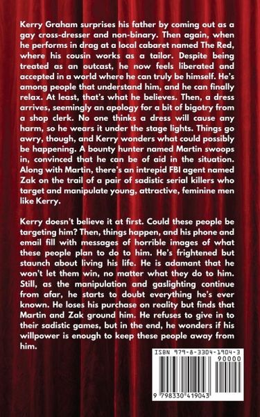 Kerry Graham surprises his father by coming out as a gay cross-dresser and non-binary. Then again, when he performs in drag at a local cabaret named The Red, where his cousin works as a tailor. Despite being treated as an outcast, he now feels liberated and accepted in a world where he can truly be himself. He's among people that understand him, and he can finally relax. At least, that's what he believes. Then, a dress arrives, seemingly an apology for a bit of bigotry from a shop clerk. No one thinks a dress will cause any harm, so he wears it under the stage lights. Things go awry, though, and Kerry wonders what could possibly be happening. A bounty hunter named Martin swoops in, convinced that he can be of aid in the situation. Along with Martin, there's an intrepid FBI agent named Zak on the trail of a pair of sadistic serial killers who target and manipulate young, attractive, feminine men like Kerry. Kerry doesn't believe it at first. Could these people be targeting him? Then, things happen, and his phone and email fill with messages of horrible images of what these people plan to do to him. He's frightened but staunch about living his life. He is adamant that he won't let them win, no matter what they do to him. Still, as the manipulation and gaslighting continue from afar, he starts to doubt everything he's ever known. He loses his purchase on reality but finds that Martin and Zak ground him. He refuses to give in to their sadistic games, but in the end, he wonders if his willpower is enough to keep these people away from him.