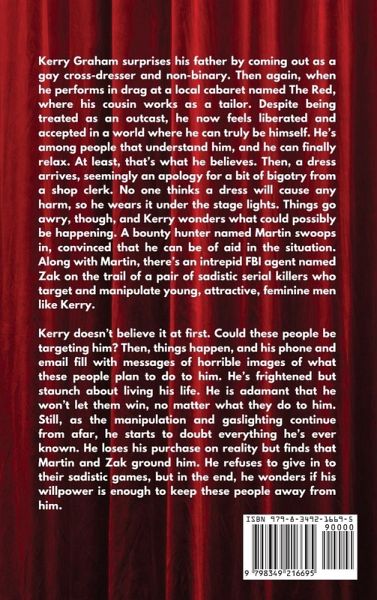 Kerry Graham surprises his father by coming out as a gay cross-dresser and non-binary. Then again, when he performs in drag at a local cabaret named The Red, where his cousin works as a tailor. Despite being treated as an outcast, he now feels liberated and accepted in a world where he can truly be himself. He's among people that understand him, and he can finally relax. At least, that's what he believes. Then, a dress arrives, seemingly an apology for a bit of bigotry from a shop clerk. No one thinks a dress will cause any harm, so he wears it under the stage lights. Things go awry, though, and Kerry wonders what could possibly be happening. A bounty hunter named Martin swoops in, convinced that he can be of aid in the situation. Along with Martin, there's an intrepid FBI agent named Zak on the trail of a pair of sadistic serial killers who target and manipulate young, attractive, feminine men like Kerry. Kerry doesn't believe it at first. Could these people be targeting him? Then, things happen, and his phone and email fill with messages of horrible images of what these people plan to do to him. He's frightened but staunch about living his life. He is adamant that he won't let them win, no matter what they do to him. Still, as the manipulation and gaslighting continue from afar, he starts to doubt everything he's ever known. He loses his purchase on reality but finds that Martin and Zak ground him. He refuses to give in to their sadistic games, but in the end, he wonders if his willpower is enough to keep these people away from him.