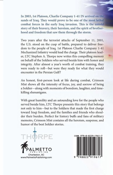 In 2003, 1st Platoon, Charlie Company 1-41 IN arrived on the sands of Iraq. They would prove to be one of the most lethal combat forces in the early Iraq invasion. This is the untold story of their bravery, their heroism, and the spirit of brotherhood and freedom that saw them through the storm. Two years after the terrorist attacks of September 11, 2001, the U.S. stood on the cusp of battle, prepared to deliver freedom to the people of Iraq. 1st Platoon Charlie Company 1-41 Mechanized Infantry would lead the charge. Their platoon leader, LTC Stephen A. Thorpe now writes this compelling memoir on behalf of the soldiers who served beside him with honor and integrity. After almost a year's worth of combat training, they were ready to roll-but were they ready for what they would encounter in the Persian Gulf? An honest, first-person look at life on an overseas tour, Crimson Mist shows all the intensity of focus, joy, and sorrow of being a soldier-along with moments of boredom, laughter, and time-killing shenanigans. With great humility and an astounding love for the people who served beside him, LTC Thorpe presents this story that belongs not only to him-but to the soldiers that made the first charge toward Iraqi freedom, and the families and friends who shoulder their burden. Perfect for history buffs and fans of military memoirs, Crimson Mist contains all the heroism, suspense, and humor of the best soldier stories.