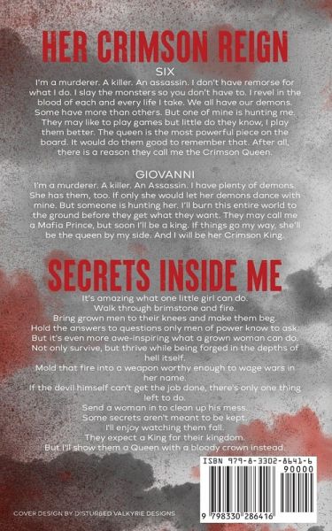 HER CRIMSON REIGN - BOOK #1 SIX I'm a murderer. A killer. An assassin. I don't have remorse for what I do. I slay the monsters so you don't have to. I revel in the blood of each and every life I take. We all have our demons. Some have more than others. But one of mine is hunting me. They may like to play games but little do they know, I play them better. The queen is the most powerful piece on the board. It would do them good to remember that. After all, there is a reason they call me the Crimson Queen. GIOVANNI I'm a murderer. A killer. An Assassin. I have plenty of demons. She has them, too. If only she would let her demons dance with mine. But someone is hunting her. I'll burn this entire world to the ground before they get what they want. They may call me a Mafia Prince, but soon I'll be a king. If things go my way, she'll be the queen by my side. And I will be her Crimson King. SECRETS INSIDE ME - BOOK #2 It's amazing what one little girl can do. Walk through brimstone and fire. Bring grown men to their knees and make them beg. Hold the answers to questions only men of power know to ask. But it's even more awe-inspiring what a grown woman can do. Not only survive, but thrive while being forged in the depths of hell itself. Mold that fire into a weapon worthy enough to wage wars in her name. If the devil himself can't get the job done, there's only one thing left to do. Send a woman in to clean up his mess. Some secrets aren't meant to be kept. I'll enjoy watching them fall. They expect a King for their kingdom. But I'll show them a Queen with a bloody crown instead.