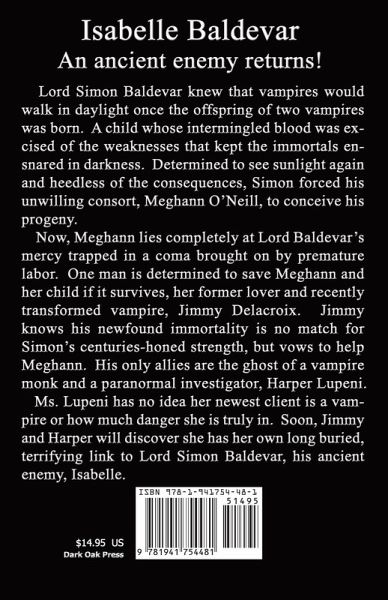 Lord Simon Baldevar knew that vampires would walk in daylight once the offspring of two vampires was born. A child whose intermingled blood excised of the weaknesses that kept the immortals ensnared in darkness. Determined to see sunlight again and heedless of the consequences, Simon forced his unwilling consort, Meghann O'Neill, to conceive his progeny. Now, Meghann lies completely at Lord Baldevar's mercy trapped in a coma brought on by premature labor. One man is determined to save Meghann and her child if it survives, her former lover and recently transformed vampire, Jimmy Delacroix. Jimmy knows his newfound immortality is no match for Simon's centuries-honed strength, but vows to help Meghann. His only allies are the ghost of a vampire monk and a paranormal investigator, Harper Lupeni. Ms. Lupeni has no idea her newest client is a vampire or how much danger she is truly in. Soon, Jimmy and Harper will discover she has her own long buried, terrifying link to Lord Simon Baldevar, his ancient enemy, Isabelle.