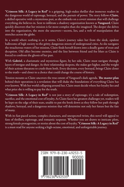 "Crimson Silk: A Legacy in Red" is a gripping, high-stakes thriller that immerses readers in the dangerous world of espionage, betrayal, and the pursuit of power. The story follows Claire, a skilled operative with a mysterious past, as she embarks on a covert mission that will challenge everything she believes in. Sent to infiltrate a shadowy organization known as Vanguard, Claire quickly discovers that her mission is far more complex than she imagined. The deeper she delves into the organization, the more she uncovers-secrets, lies, and a web of manipulation that stretches across the globe. In a world where nothing is as it seems, Claire's journey takes her from the sleek, opulent ballrooms of high society to the gritty, dangerous streets of underground cities. As she navigates the treacherous waters of her mission, Claire finds herself drawn into a deadly game of trust and deception. Old allies become enemies, and the line between friend and foe blurs as Claire is forced to confront the ghosts of her past. With Gabriel, a charismatic and mysterious figure, by her side, Claire must navigate through layers of intrigue and danger. As their relationship deepens, the stakes get higher, and the weight of their actions threatens to crush them both. Every decision, every betrayal, brings Claire closer to the truth-and closer to a choice that could change the course of history. Tension mounts as Claire uncovers the true extent of Vanguard's dark agenda. The master plan behind their operations is a revelation that will shake the foundations of everything Claire has ever known. With her world collapsing around her, Claire must decide where her loyalty lies and what price she is willing to pay for the truth. "Crimson Silk: A Legacy in Red" is not just a story of espionage; it's a tale of redemption, sacrifice, and the emotional cost of loyalty. As Claire faces her greatest challenges yet, readers will be kept on the edge of their seats, unable to put the book down as they follow her path through shadows, betrayal, and a dangerous mission that will determine not only her future but the fate of many. With its fast-paced action, complex characters, and unexpected twists, this novel will appeal to fans of thrillers, espionage, and romantic suspense. Whether you are drawn to intricate plots, strong female protagonists, or stories about the cost of loyalty, "Crimson Silk: A Legacy in Red" is a must-read for anyone seeking a high-octane, emotional, and unforgettable journey.