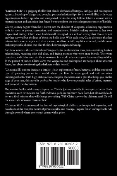 "Crimson Silk" is a gripping thriller that blends elements of betrayal, intrigue, and redemption against a backdrop of danger and complex personal relationships. Set in a world filled with secret organizations, hidden agendas, and unexpected twists, the story follows Claire, a woman with a mysterious past and a mission that forces her to confront the most dangerous corners of her life. Claire's journey begins when she is drawn into the clutches of Vanguard, a shadowy organization with its roots in power, corruption, and manipulation. Initially seeking answers to her own fragmented history, Claire soon finds herself entangled in a web of secrecy that threatens not only her survival but the lives of those she holds dear. With each step, Claire discovers that her mission is far more complicated than it seems, as alliances shift, loyalties are tested, and she must make impossible choices that blur the line between right and wrong. As Claire unravels the secrets behind Vanguard, she confronts her own past-revisiting broken relationships, reuniting with old allies, and facing enemies who were once friends. The twists come fast, and Claire must decide who to trust in a world where everyone has something to hide. In the pursuit of justice, Claire learns that vengeance and redemption are not just about external forces, but about confronting the darkness within herself. "Crimson Silk" is more than just a thriller; it's an exploration of trust, betrayal, and the emotional cost of pursuing justice in a world where the lines between good and evil are often indistinguishable. With high-stakes action, complex characters, and a plot that keeps you on the edge of your seat, this novel is perfect for readers who love suspenseful tales of crime, mystery, and personal transformation. The tension builds with every chapter, as Claire's journey unfolds in unexpected ways. Each revelation, each twist, takes her further down a path she can't turn back from, but ultimately leads her to a final mission that will change everything. Will Claire survive the ultimate test? Or will the secrets she uncovers consume her? "Crimson Silk" is a must-read for fans of psychological thrillers, action-packed mysteries, and novels about the complex nature of power, loyalty, and revenge. Prepare for an unforgettable ride through a world where every truth comes with a price.