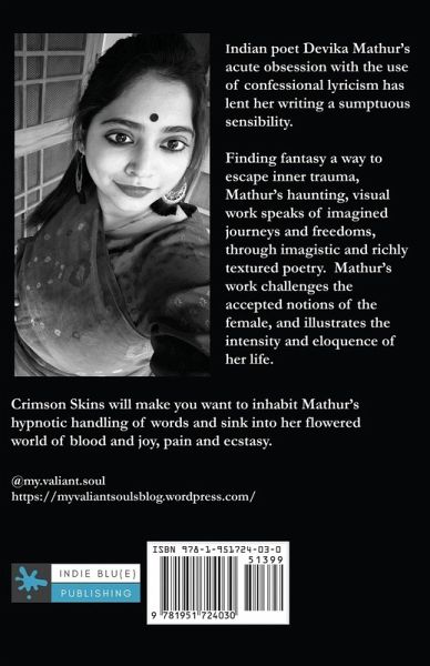 Indian poet Devika Mathur's acute obsession with the use of confessional lyricism has lent her writing a sumptuous sensibility. Finding fantasy a way to escape inner trauma, Mathur's haunting, visual work speaks of imagined journeys and freedoms, through imagistic and richly textured poetry. Mathur's work challenges the accepted notions of the female, and illustrates the intensity and eloquence of her life. Crimson Skins will make you want to inhabit Mathur's hypnotic handling of words and sink into her flowered world of blood and joy, pain and ecstasy.