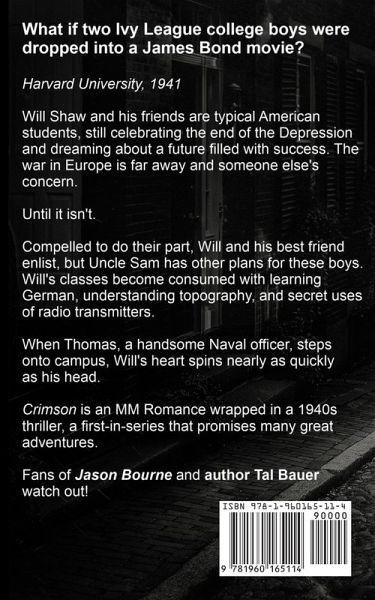 Will Shaw and his friends are typical American students, still celebrating the end of the Depression and dreaming about a future filled with success. The war in Europe is far away and someone else's concern. Until it isn't. Compelled to do their part, Will and his best friend enlist, but Uncle Sam has other plans for these boys. Will's classes become consumed with learning German, understanding topography, and secret uses of radio transmitters. When Thomas, a handsome Naval officer, steps onto campus, Will's heart spins nearly as quickly as his head. Crimson is a slow-burn MM Romance wrapped in a 1940s thriller, a first-in-series that promises many great adventures.