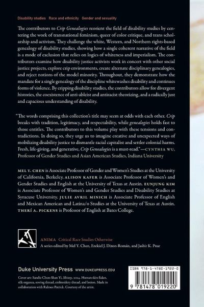 The contributors to Crip Genealogies reorient the field of disability studies by centering the work of transnational feminism, queer of color critique, and trans scholarship and activism. They challenge the white, Western, and Northern rights-based genealogy of disability studies, showing how a single coherent narrative of the field is a mode of exclusion that relies on logics of whiteness and imperialism. The contributors examine how disability justice activists work in concert with other social justice projects, explore crip environments, create alternate disciplinary genealogies, and reject notions of the model minority. Throughout, they demonstrate how the mandate for a single genealogy of the discipline whitewashes disability and continues forms of violence. By cripping disability studies, the contributors allow for divergent histories, the coexistence of anti-ableist and antiracist theorizing, and a radically just and capacious understanding of disability. Contributors. Suzanne Bost, Mel Y. Chen, Sony Coráñez Bolton, Natalia Duong, Lezlie Frye, Magda García, Alison Kafer, Eunjung Kim, Yoo-suk Kim, Kate¿ina Kolá¿ová, James Kyung-Jin Lee, Stacey Park Milbern, Julie Avril Minich, Tari Young-Jung Na, Therí A. Pickens, Leah Lakshmi Piepzna-Samarasinha, Jasbir K. Puar, Sami Schalk, Faith Njahîra Wangarî