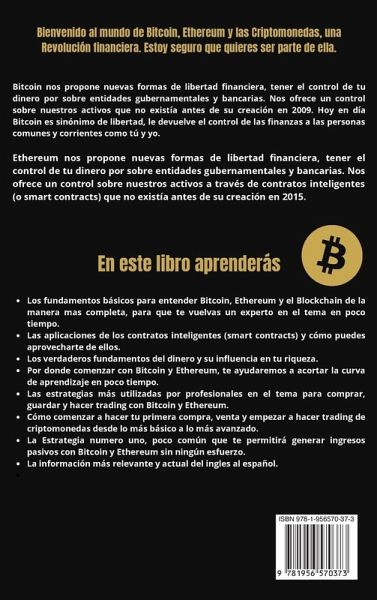 Bienvenido al mundo de Bitcoin, Ethereum y las Criptomonedas, una Revolución financiera. Estoy seguro que quieres ser parte de ella. Bitcoin nos propone nuevas formas de libertad financiera, tener el control de tu dinero por sobre entidades gubernamentales y bancarias. Nos ofrece un control sobre nuestros activos que no existía antes de su creación en 2009. Hoy en día Bitcoin es sinónimo de libertad, le devuelve el control de las finanzas a las personas comunes y corrientes como tú y yo. Ethereum nos propone nuevas formas de libertad financiera, tener el control de tu dinero por sobre entidades gubernamentales y bancarias. Nos ofrece un control sobre nuestros activos a través de contratos inteligentes (o smart contracts) que no existía antes de su creación en 2015. En este libro aprenderás: Los fundamentos básicos para entender Bitcoin, Ethereum y el Blockchain de la manera mas completa, para que te vuelvas un experto en el tema en poco tiempo. Las aplicaciones de los contratos inteligentes (smart contracts) y cómo puedes aprovecharte de ellos. Los verdaderos fundamentos del dinero y su influencia en tu riqueza. Por donde comenzar con Bitcoin y Ethereum, te ayudaremos a acortar la curva de aprendizaje en poco tiempo. Las estrategias más utilizadas por profesionales en el tema para comprar, guardar y hacer trading con Bitcoin y Ethereum. Cómo comenzar a hacer tu primera compra, venta y empezar a hacer trading de criptomonedas desde lo más básico a lo más avanzado. La Estrategia numero uno, poco común que te permitirá generar ingresos pasivos con Bitcoin y Ethereum sin ningún esfuerzo. La información más relevante y actual del ingles al español. y ¡mucho más!