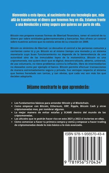 Bienvenido a esta época, al nacimiento de una tecnología que, más allá de transformar el dinero que tenemos hoy en día. Estamos frente a una Revolución y estoy seguro que quieres ser parte de ella. Bitcoin nos propone nuevas formas de libertad financiera, tener el control de tu dinero por sobre entidades gubernamentales y bancarias. Nos ofrece un control sobre nuestros activos que no existía antes de su creación en 2009. Bitcoin es sinónimo de libertad. Le devuelve el control a las personas comunes y corrientes como tú y yo. Bitcoin es, al mismo tiempo, una moneda y un sistema monetario cuyo buen funcionamiento no depende de la benevolencia de una autoridad sino de las inmutables leyes de la matemática. Bitcoin es una criptomoneda, eso quiere decir que es digital, descentralizado, abierto, universal, de uso voluntario, no tiene problemas contra la inflación, libre de intermediarios no deseados, como por ejemplo el banco. Bitcoin permite efectuar transacciones de manera extremadamente segura y privada. Sus ventajas respecto al sistema que hemos heredado son tantas, y tan obvias, que cada vez son más los que deciden adoptarlo. En este libro aprenderás:Los fundamentos básicos para entender Bitcoin y el Blockchain. Como empezar con Bitcoin, Ethereum, XRP, Ripple, Bitcoin Cash y otras criptomonedas mas, por nombrar algunas. La mejor manera de evitar estafas y SCAMS dentro del mundo de las criptomonedas. Las altcoins que te podrán hacer rico en este 2022 y 2023 si inviertes en ellas. Cómo comenzar a hacer tu primera compra y venta y empezar a hacer trading de criptomonedas desde lo más básico a lo más avanzado. ¡y mucho mucho más! Pulsa comprar y nos vemos en el interior del libro.