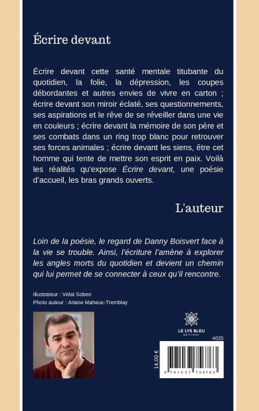 Écrire devant cette santé mentale titubante du quotidien, la folie, la dépression, les coupes débordantes et autres envies de vivre en carton ; écrire devant son miroir éclaté, ses questionnements, ses aspirations et le rêve de se réveiller dans une vie en couleurs ; écrire devant la mémoire de son père et ses combats dans un ring trop blanc pour retrouver ses forces animales ; écrire devant les siens, être cet homme qui tente de mettre son esprit en paix. Voilà les réalités qu'expose Écrire devant, une poésie d¿accueil, les bras grands ouverts.