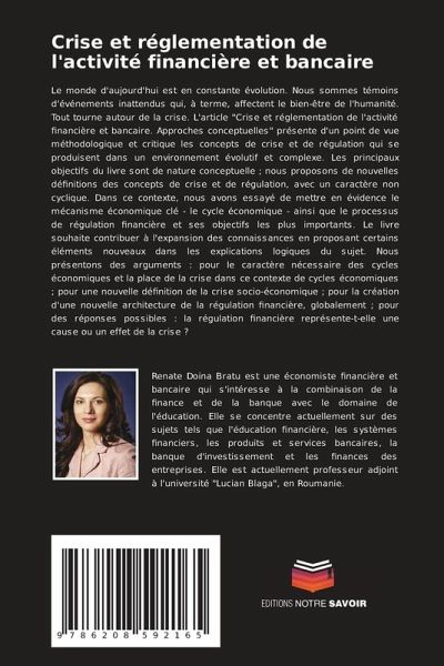 Le monde d'aujourd'hui est en constante évolution. Nous sommes témoins d'événements inattendus qui, à terme, affectent le bien-être de l'humanité. Tout tourne autour de la crise. L'article "Crise et réglementation de l'activité financière et bancaire. Approches conceptuelles" présente d'un point de vue méthodologique et critique les concepts de crise et de régulation qui se produisent dans un environnement évolutif et complexe. Les principaux objectifs du livre sont de nature conceptuelle ; nous proposons de nouvelles définitions des concepts de crise et de régulation, avec un caractère non cyclique. Dans ce contexte, nous avons essayé de mettre en évidence le mécanisme économique clé - le cycle économique - ainsi que le processus de régulation financière et ses objectifs les plus importants. Le livre souhaite contribuer à l'expansion des connaissances en proposant certains éléments nouveaux dans les explications logiques du sujet. Nous présentons des arguments : pour le caractère nécessaire des cycles économiques et la place de la crise dans ce contexte de cycles économiques ; pour une nouvelle définition de la crise socio-économique ; pour la création d'une nouvelle architecture de la régulation financière, globalement ; pour des réponses possibles : la régulation financière représente-t-elle une cause ou un effet de la crise ?