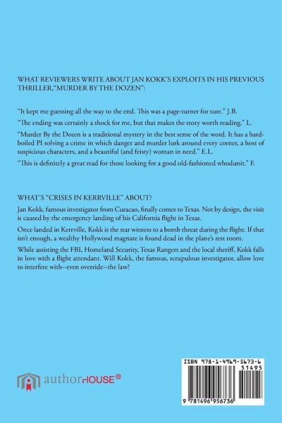 Jan Kokk, famous investigator from Curacao, finally comes to Texas. Not by design, the visit is caused by the emergency landing of his California flight in Texas. Once landed in Kerrville, Kokk is the star witness to a bomb threat during the flight. If that isn?t enough, a wealthy Hollywood magnate is found dead in the plane?s rest room. While assisting the FBI, Homeland Security, Texas Rangers and the local sheriff, Kokk falls in love with a flight attendant. Will Kokk, the famous, scrupulous investigator, allow love to interfere with--even override--the law?