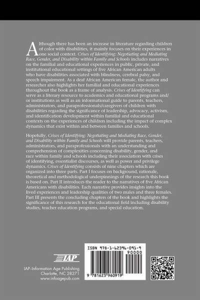 Although there has been an increase in literature regarding children of color with disabilities, it mainly focuses on their experiences in one social context. Crises of Identifying: Negotiating and Mediating Race, Gender, and Disability within Family and Schools includes narratives on the familial and educational experiences in public, private, and institutional educational settings of five African American adults who have disabilities associated with blindness, cerebral palsy, and speech impairment. As a deaf African American female, the author and researcher also highlights her familial and educational experiences throughout the book as a frame of analysis. This book can serve as a literary resource to academics and educational programs and/or institutions as well as an informational guide to parents, teachers, administrators, and paraprofessionals/ caregivers of children with disabilities regarding the significance of leadership, advocacy, activism, and identification development within familial and educational contexts on the experiences of children including the impact of complex dynamics that exist within and between families and schools. Hopefully, this book will provide parents, teachers, administrators, and paraprofessionals with an understanding and comprehension of complexities concerning disability, gender, and race within family and schools including their association with crises of identifying, essentialist discourses, as well as power and privilege dynamics. This book consists of nine chapters which are organized into three parts. Part I focuses on background, rationale, theoretical and methodological underpinnings of the research this book is based on. Part II introduces the reader to the narratives of five African Americans with disabilities. Each narrative provides insights into the lived experiences and leadership qualities of two males and three females. Part III presents the concluding chapters of the book and highlights the significance of this research for the educational field including disability studies, teacher education programs, and special education.