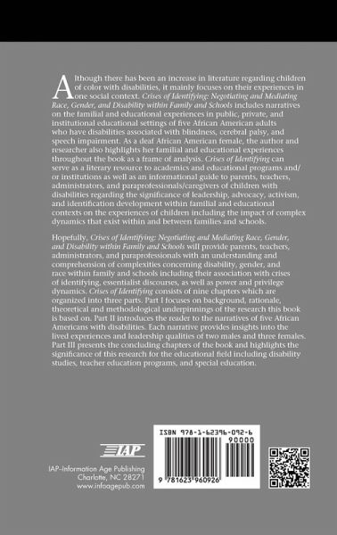 Although there has been an increase in literature regarding children of color with disabilities, it mainly focuses on their experiences in one social context. Crises of Identifying: Negotiating and Mediating Race, Gender, and Disability within Family and Schools includes narratives on the familial and educational experiences in public, private, and institutional educational settings of five African American adults who have disabilities associated with blindness, cerebral palsy, and speech impairment. As a deaf African American female, the author and researcher also highlights her familial and educational experiences throughout the book as a frame of analysis. This book can serve as a literary resource to academics and educational programs and/or institutions as well as an informational guide to parents, teachers, administrators, and paraprofessionals/ caregivers of children with disabilities regarding the significance of leadership, advocacy, activism, and identification development within familial and educational contexts on the experiences of children including the impact of complex dynamics that exist within and between families and schools. Hopefully, this book will provide parents, teachers, administrators, and paraprofessionals with an understanding and comprehension of complexities concerning disability, gender, and race within family and schools including their association with crises of identifying, essentialist discourses, as well as power and privilege dynamics. This book consists of nine chapters which are organized into three parts. Part I focuses on background, rationale, theoretical and methodological underpinnings of the research this book is based on. Part II introduces the reader to the narratives of five African Americans with disabilities. Each narrative provides insights into the lived experiences and leadership qualities of two males and three females. Part III presents the concluding chapters of the book and highlights the significance of this research for the educational field including disability studies, teacher education programs, and special education.
