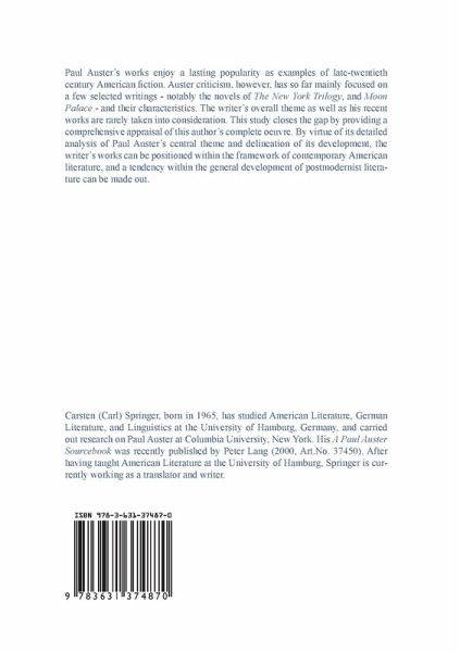 Paul Auster's works enjoy a lasting popularity as examples of late-twentieth century American fiction. Auster criticism, however, has so far mainly focused on a few selected writings - notably the novels of The New York Trilogy, and Moon Palace - and their characteristics. The writer's overall theme as well as his recent works are rarely taken into consideration. This study closes the gap by providing a comprehensive appraisal of this author's complete oeuvre. By virtue of its detailed analysis of Paul Auster's central theme and delineation of its development, the writer's works can be positioned within the framework of contemporary American literature, and a tendency within the general development of postmodernist literature can be made out.