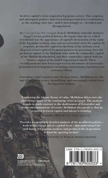 In 2011, capital's crisis erupted in Egyptian society. This eruption, and subsequent politics, have been misrepresented as revolutionary, as the working class was - and is increasingly so - devalued and disempowered. In Crisis and Class War in Egypt, Sean F. McMahon critically analyses Egypt's recent political history. He argues that the so-called 'revolution' was the appearance of capital's destruction of the value of the Egyptian working class and an existential crisis for capital. In response, productive capital in the form of the military used, disposed of and replaced its junior partners in governing; first the predatory capital of the Mubarak state with the commodity capital of the Muslim Brotherhood, and then commodity capital with the finance capital of the Gulf Cooperation Council. These reconfigurations have been expressed in all manner of reactionary governmental arrangements including constitutions, legislation and currency reform. Extending today's analysis into the near future, McMahon sees the war of Egyptian society intensifying, and increasingly violent lives for Egyptian workers.
