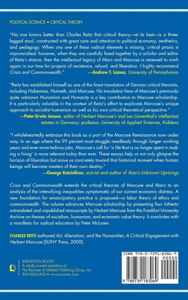 Acknowledgments Introduction. Crisis and Commonwealth: Politics, Pedagogy, Praxis Charles Reitz Chapter 1. The Political Economy of Predation and Counterrevolution: Recalling Marcuse on the Radical Goals of Socialism Charles Reitz and Stephen Spartan Chapter 2. Socialism One Sector at a Time Peter Marcuse Chapter 3. Charter 2000:A Transitional Program for Labor David Brodsky Chapter 4. "Vote for a Job"? A Short History of Contemporary Strategic Failure on the Organized Left, with Lessons for the Present Fred Whitehead Chapter 5. U.S. Capitalism and Militarism in Crisis? Our Political Work Today Douglas Dowd Chapter 6. Empire as a Way of Life: CourseOutline and Bibliography John Marciano Chapter 7. Surplus Over-Appropriation and the Reproduction Crisis in the Western Roman Empire Stephen Spartan Chapter 8. An Essay on Repressive Education: Marcuse, Marx, Adorno, and the Future of Emancipatory Learning Arnold L. Farr Chapter 9. Can Democratic Education Survive in a Neoliberal Society? Henry A. Giroux Chapter 10. Defeating Corporate Blueprints, White Papers, and Blue Ribbon Task Forces: Academic Labor Reclaims Public Higher Education for the Public Patricia P. Brodsky Chapter 11. Art as a Manifestation of the Struggle for Human Emancipation: A Non-Dogmatic Marxist Position in Aesthetics Zvi Tauber Chapter 12. A Labor Theory of Ethics and Commonwealth: Recalling a "New" Marcuse Charles Reitz Chapter 13. Diversity, Equality, Empowerment in Politics and Education Charles Reitz Chapter 14. Cultural Origins of African Humanism and Socialism (Ujamaa) Alfred T. Kisubi Chapter 15. The Second Assassination of Dr. King Lloyd C. Daniel Chapter 16. Year Two of Arab Revolutions Kevin Anderson Chapter 17. Revolutionary Critical Pedagogy for a Socialist Society: A Manifesto Peter McLaren Chapter 18. The Communist Horizon Jodi Dean Conclusion. The Commonwealth Counter-Offensive Charles Reitz Appendix. Four Manuscripts on Value Theory, Humanism, and Socialism Herbert Marcuse Name Index Subject Index About the Contributors
