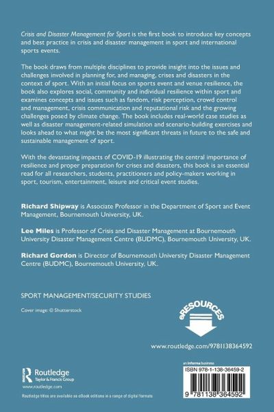 1. An Introduction to Managing Crises and Disasters in Sport 2. Criticality of Sports Events and Venue Resilience 3. Fandom and Risk Perceptions in Sport 4. Synergising Social Community and Individual Resilience Perspectives 5. Crowd Management Control Safety and Behaviour 6. Sport Event Resilience and Cascading Disasters 7. Synergising Public and Private Dimensions of Sport Event and Venue Resilience 8. Crisis Communication for Sport: Handling Issues of Reputational Risk Litigation and Culpability 9. Simulating Disaster Scenarios for International Sports Events and International Sports Venues 10. Future Directions for Managing Crises and Disasters in Sport