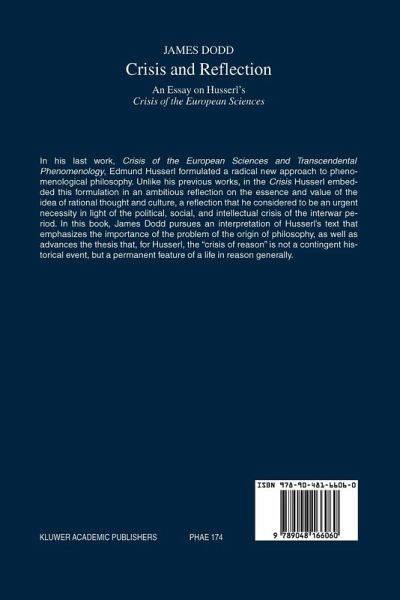 In his last work, "Crisis of the European Sciences and Transcendental Phenomenology", Edmund Husserl formulated a radical new approach to phenomenological philosophy. Unlike his previous works, in the "Crisis" Husserl embedded this formulation in an ambitious reflection on the essence and value of the idea of rational thought and culture, a reflection that he considered to be an urgent necessity in light of the political, social, and intellectual crisis of the interwar period. In this book, James Dodd pursues an interpretation of Husserl's text that emphasizes the importance of the problem of the origin of philosophy, as well as advances the thesis that, for Husserl, the "crisis of reason" is not a contingent historical event, but a permanent feature of a life in reason generally.