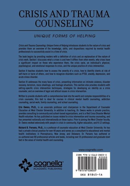 Crisis and Trauma Counseling: Unique Forms of Helping introduces students to the nature of crisis and provides them an overview of the knowledge, skills, and dispositions required by mental health professionals to successfully assist in a time of crisis. The book begins by providing readers with a definition of crisis and an explanation of the nature of crisis work. Section I discusses what a crises is and how it differs from other events, why crises have a significant impact on those who experience them, the crisis cycle, an individual's physical, psychological, and emotional responses to crisis, and the unique practice of crisis intervention. Section II teaches students how to assess the severity of a crisis, how to identify clients at risk of self-harm or harm of others, and how to recognize disorders such as PTSD, anxiety, depression, and acute stress disorder. Section III addresses the many faces of crisis, presenting information on intimate violence, disaster recovery, terrorism, mass shootings, and hostage situations. This section also provides students with setting-specific crisis intervention techniques, strategies for developing an identity as a crisis counselor, and an overview of legal and ethical issues in crisis intervention. Written to provide students with a comprehensive look into the world and complex responsibilities of a crisis counselor, this text is ideal for courses in clinical mental health counseling, addiction counseling, social work, family counseling, and school counseling. Eric Owens, Ph.D., is an associate professor and chairperson in the Department of Counselor Education at West Chester University. In addition to teaching, Dr. Owens works in private practice, provides consulting to community and school-based organizations, and is a Red Cross Disaster Mental Health volunteer. He has published on issues related to crisis intervention and trauma counseling, and has presented nationally and internationally on these topics. Prior to joining the West Chester faculty, Dr. Owens worked extensively with people in crisis in community, higher education, and K-12 settings. Richard D. Parsons, Ph.D., is a professor of counselor education at West Chester University. He has had a private clinical practice for over 40 years and serves as a consultant to educational and mental health institutions in Pennsylvania, New Jersey, and Delaware. Dr. Parsons has authored or co-authored over 80 professional articles and books, including over 35 professional and graduate level text in the areas of mental health and counseling.