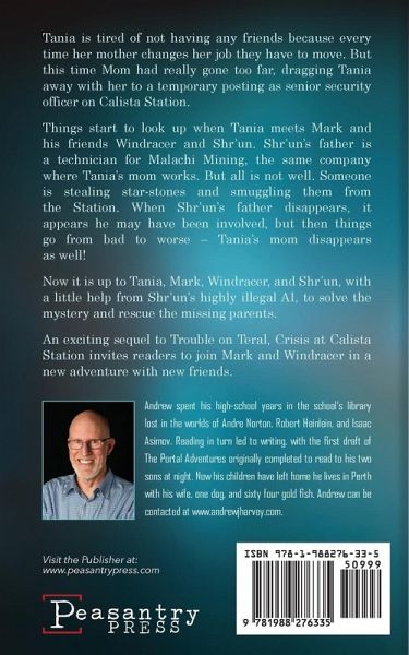 Tania is tired of not having any friends because every time her mother changes her job they have to move. But this time Mom had really gone too far, dragging Tania away with her to a temporary posting as senior security officer on Calista Station. Things start to look up when Tania meets Mark and his friends Windracer and Shr'un. Shr'un's father is a technician for Malachi Mining, the same company where Tania's mom works. But all is not well. Someone is stealing star-stones and smuggling them from the Station. When Shr'un's father disappears, it appears he may have been involved, but then things go from bad to worse - Tania's mom disappears as well! Now it is up to Tania, Mark, Windracer, and Shr'un, with a little help from Shr'un's highly illegal AI, to solve the mystery and rescue the missing parents. An exciting sequel to The Trouble on Teral, Crisis at Calista Station invites readers to join Mark and Windracer in a new adventure with new friends.