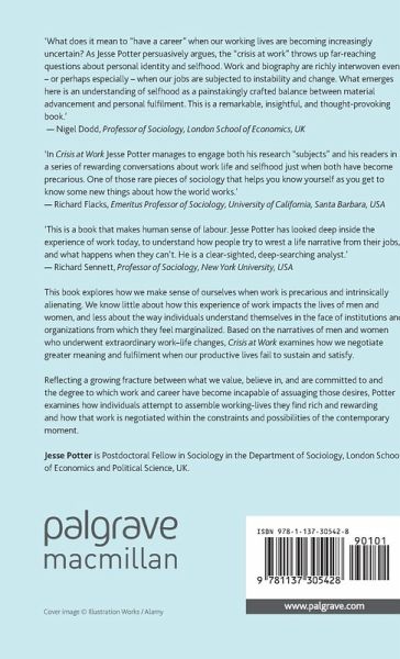 "Jesse Potter's new book Crisis at Work is an attempt to gauge the saliency of some of these wilder claims by studying a series of people experiencing significant upheaval in their working careers. ... Potter's introductory scene setting material is a useful summation of current debates in the field and as a whole it provides a snapshot of work orientation among a narrow group of middle-class workers confronting change." (Tim Strangleman, British Journal of Sociology, Vol. 67 (1), January, 2016)