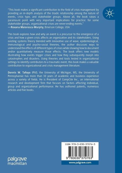 This book explores how and why an event is a precursor to the emergence of a crisis and how a given crisis affects an organization and its stakeholders. Using existing systems theory blended with innovative use of wave, epidemiological, immunological and psycho-social theories, the author discusses ways to understand the effects of different types of crises while showing how to document and/or quantitatively measure those effects. The book offers new models illustrating how events trigger crises and how they subsequently morph into catastrophes and disasters. Using theories and tools tested in organizational settings to identify contributors to a traumatic event, this book makes a valuable contribution to organizational and crisis management literature.